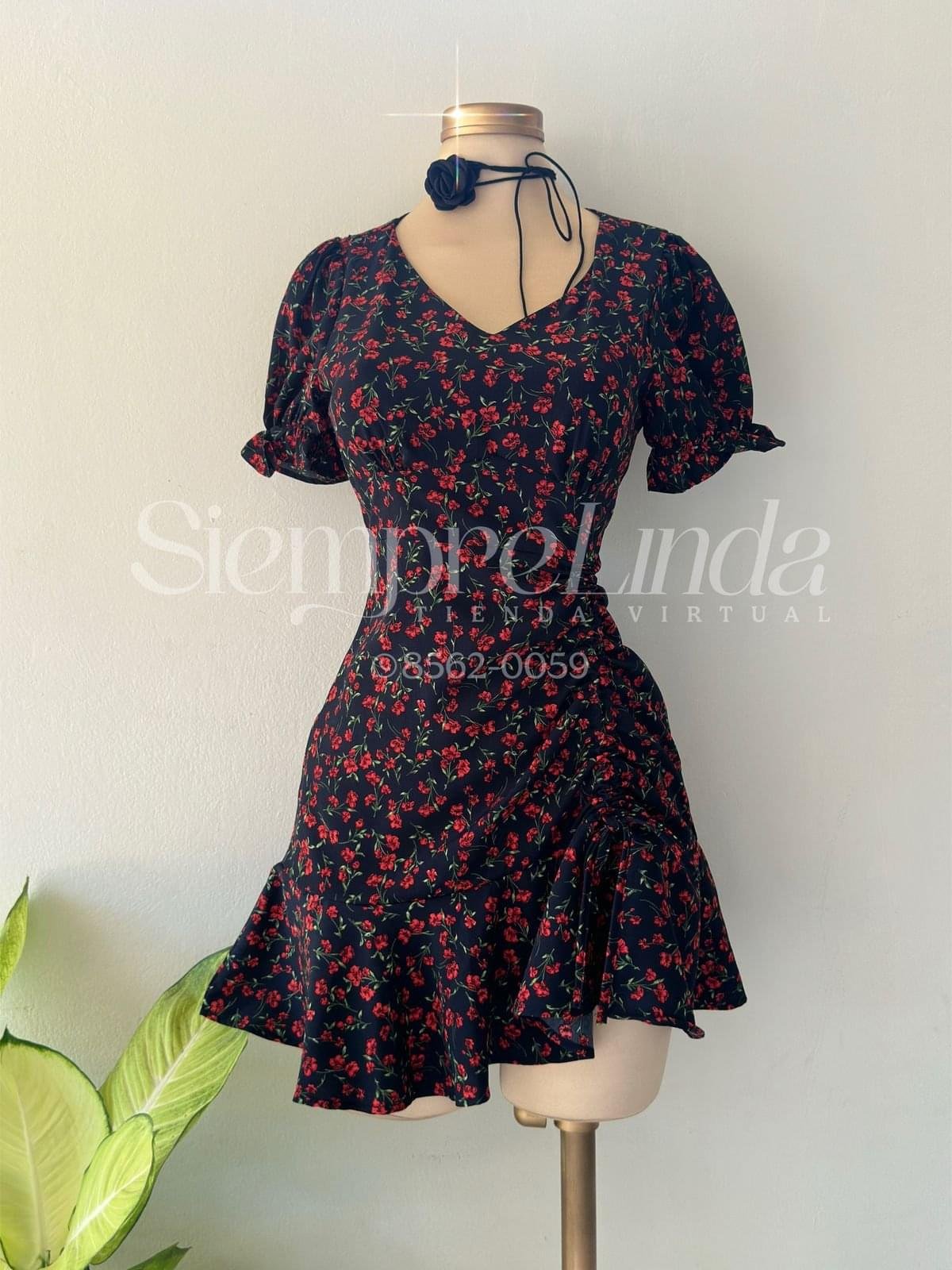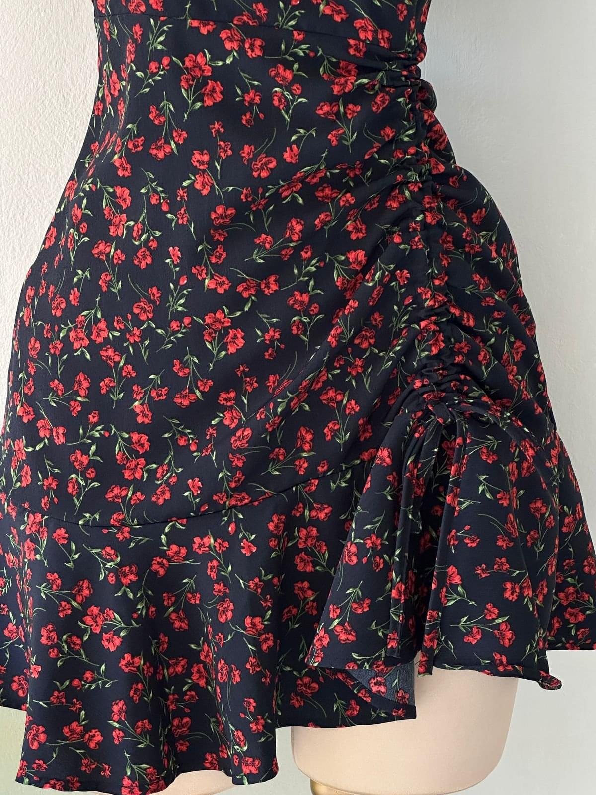 Vestido corto floral con cordón fruncido de manga corta