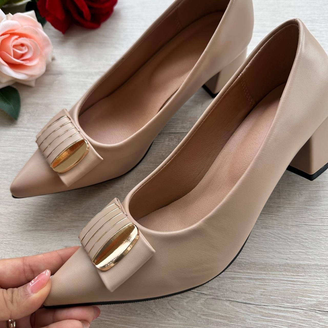 Zapatos beige de tacón grueso y punta con diseño talla 37